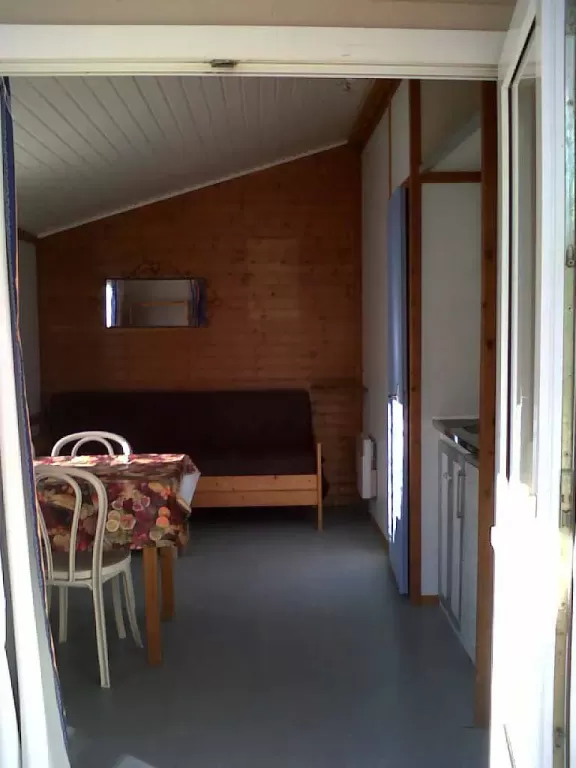 - Salon avec banquette convertible et rideau d'intimité.