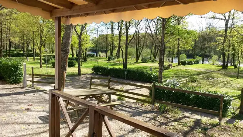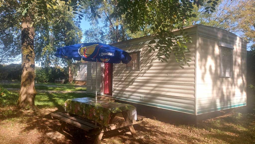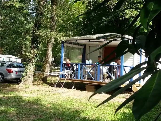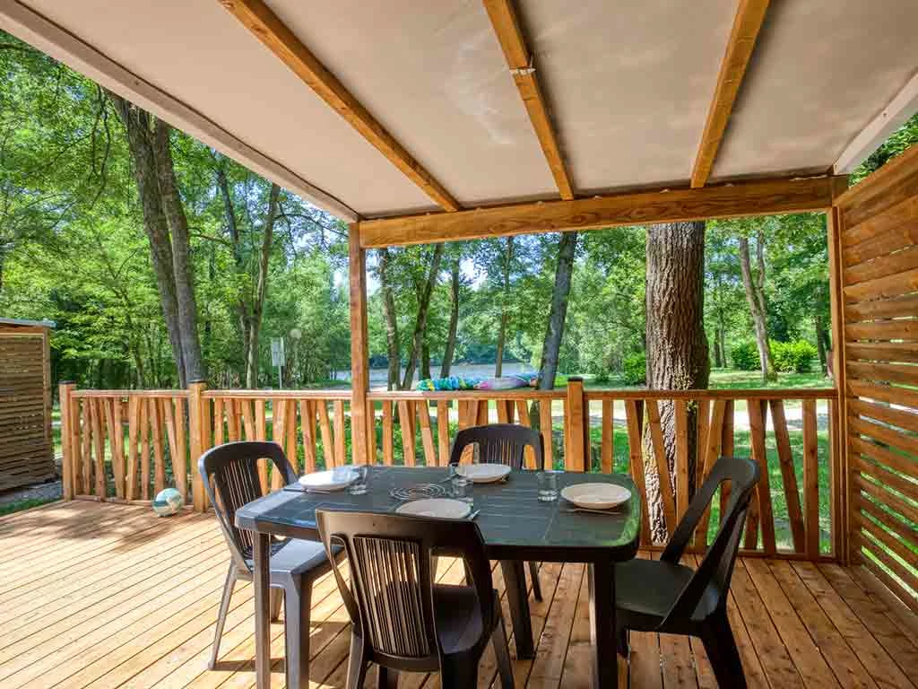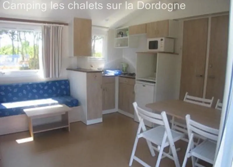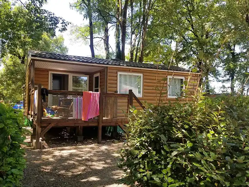 Vacances dedans-dehors avec ce mobil home type chalet et son bardage imitation bois. Tout confort, 3 chambres, TV, terrasse au sol couverte, pour 6 personnes, face au terrain avec la Dordogne à 80m.