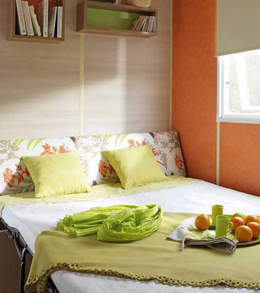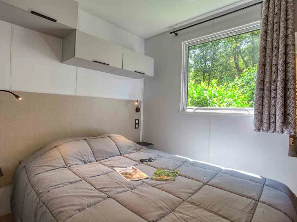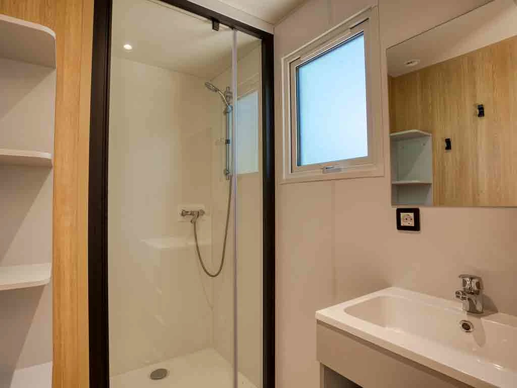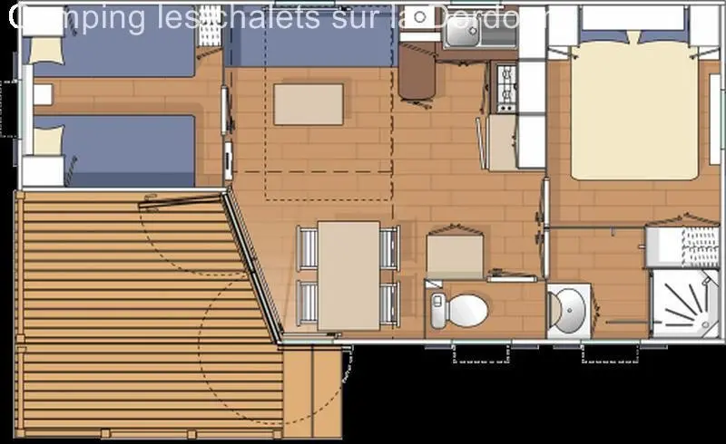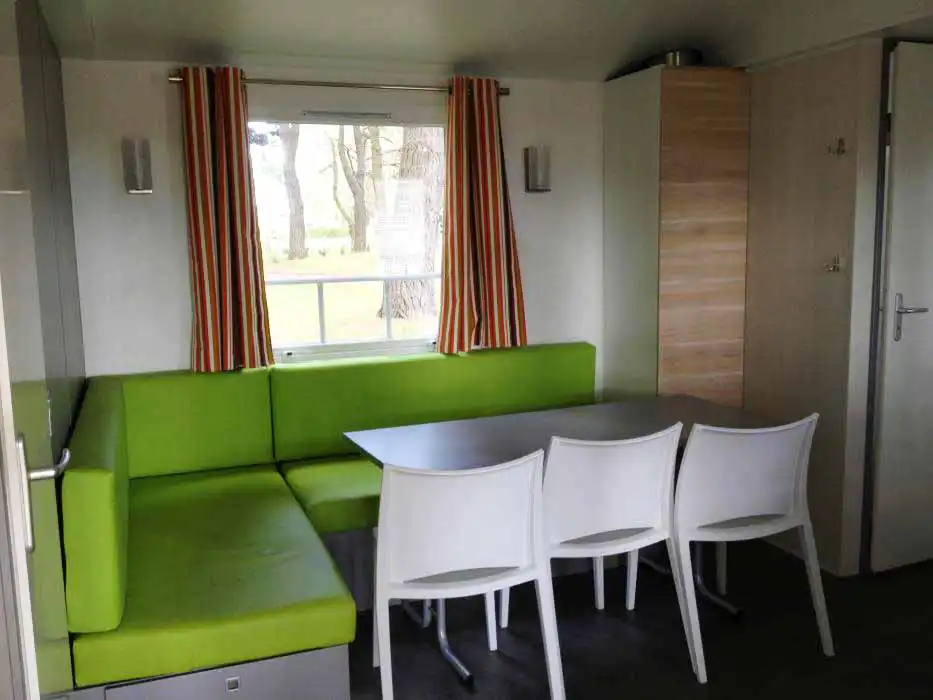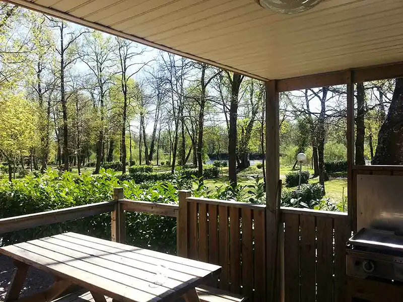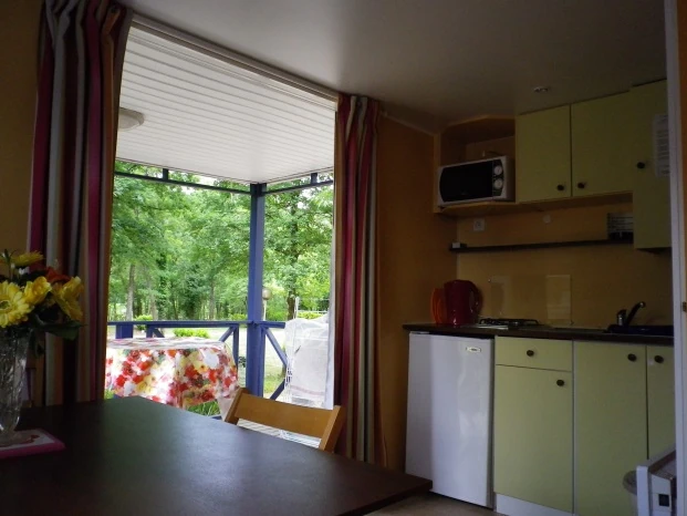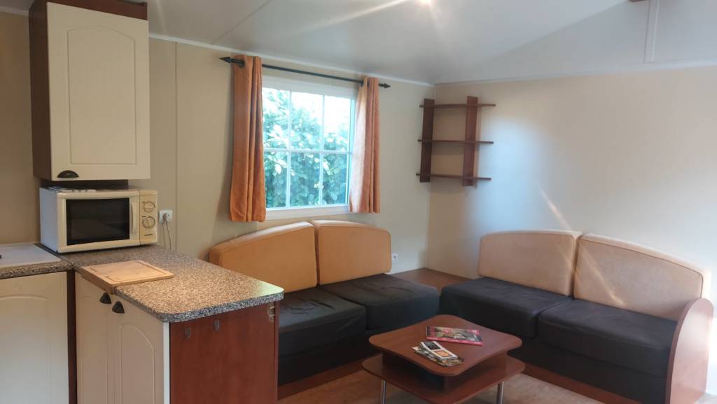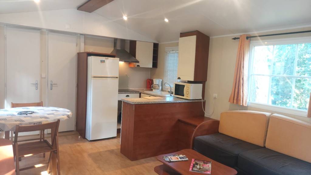 Chalet mobile spacieux et lumineux ouvert sur une terrasse couverte de 8m2, pouvant accueillir de 4 à 6 personnes.