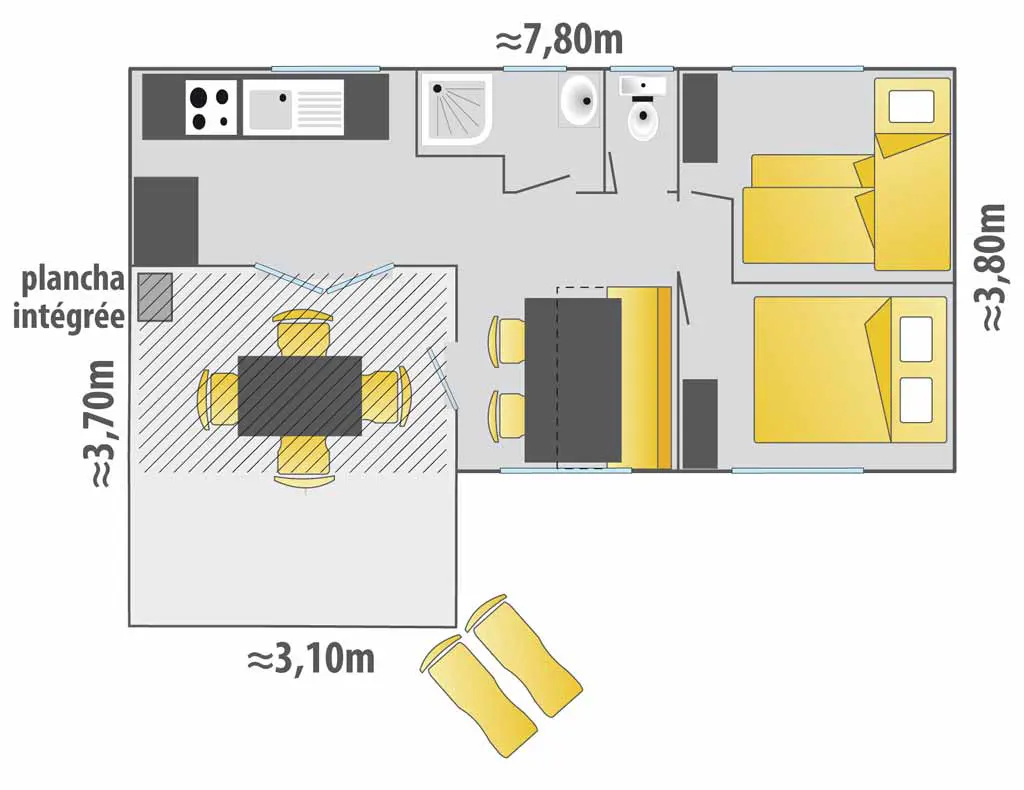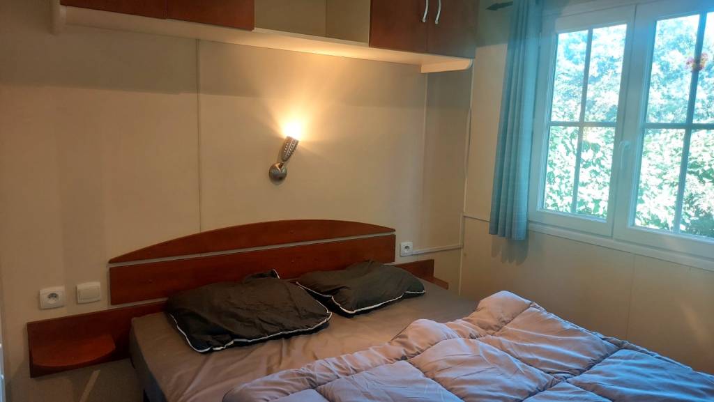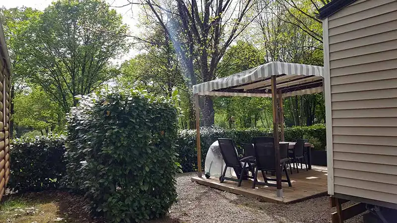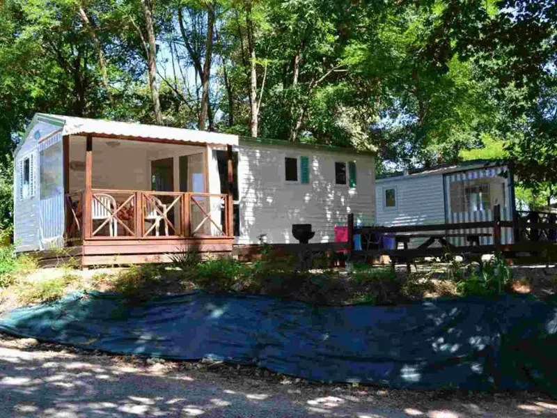 Mobil home pour 5 personnes, terrasse semi-couverte de 7m² avec une plancha.