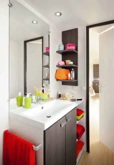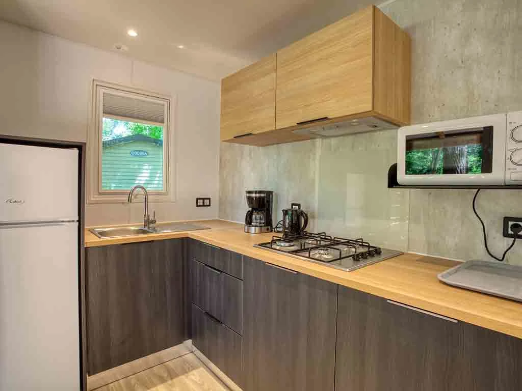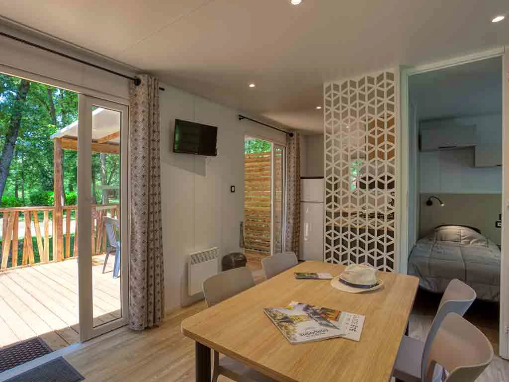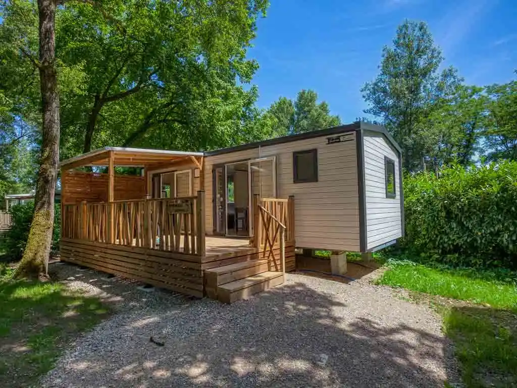 Chalet mobile spacieux et lumineux avec une terrasse de plein pied pouvant accueillir de 4 à 6 personnes.